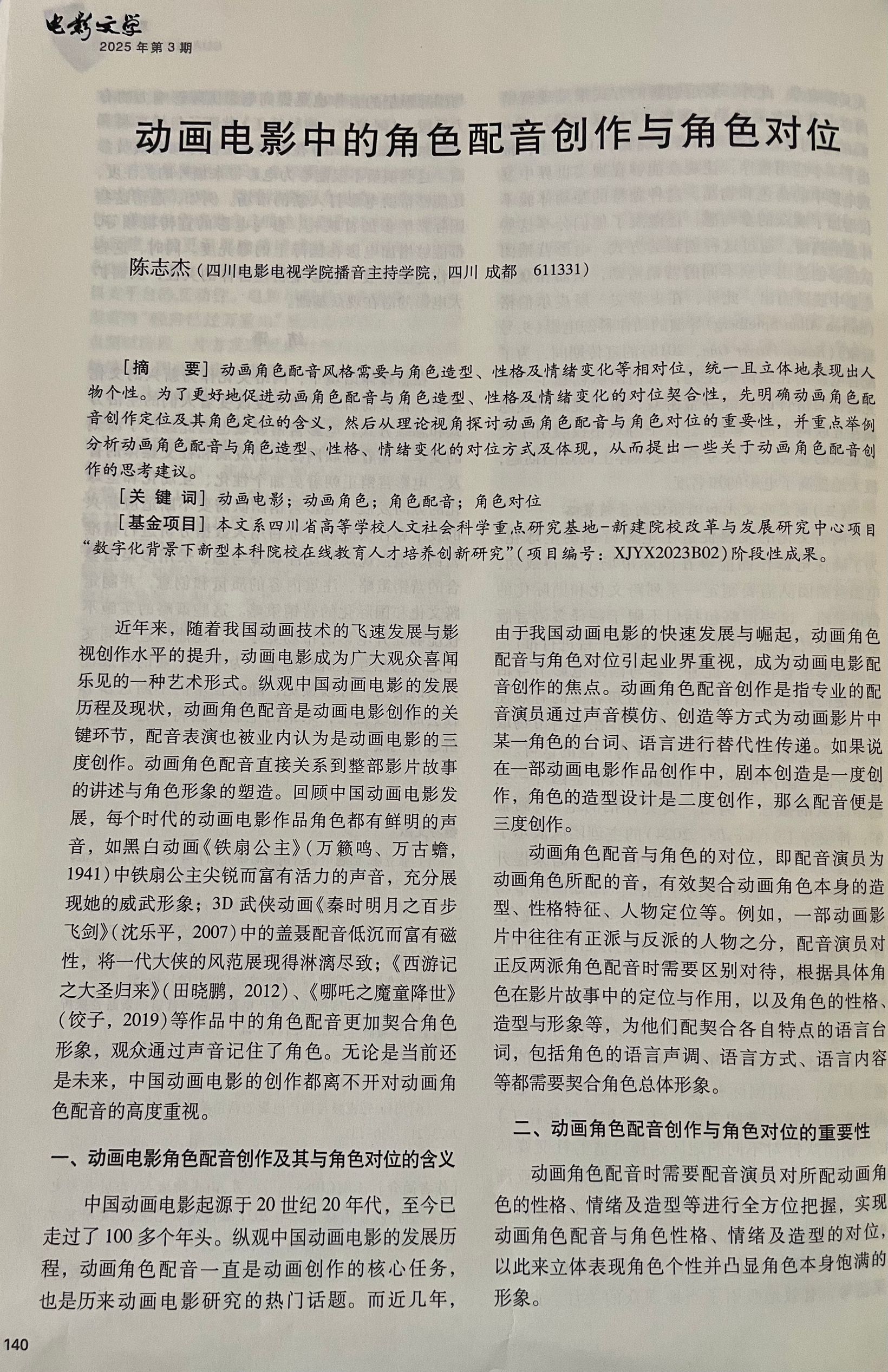 近日,我校陈志杰副教授撰写的论文《动画电影中的角色配音创作与角色对位》在全国中文核心期刊《电影文学》正式发表。该论文为四川省高等学校人文社会科学重点研究基地——新建院校改革与发展研究中心项目《数字化背景下新型本科院校在线教育人才培养创新研究》(项目编号:XJYX2023B02)的阶段性成果。