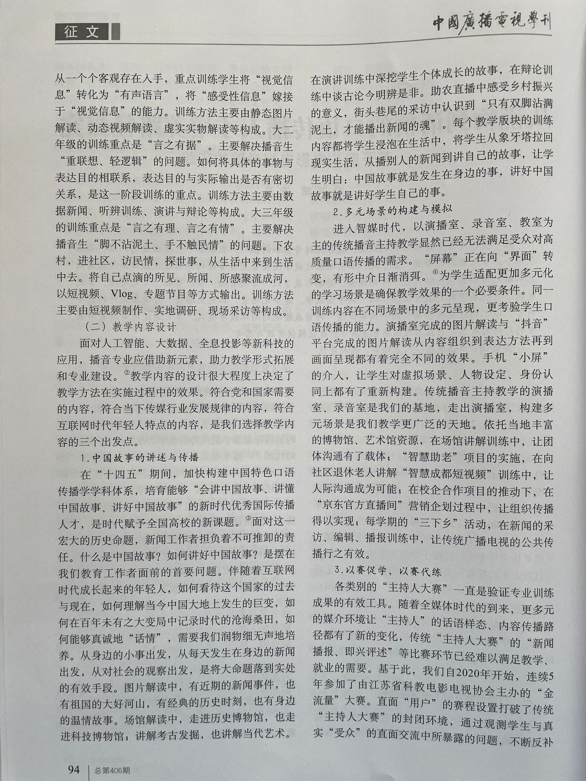 近日,我校刘威副教授撰写的论文《从说物到话情的口语传播人才培养路径探究——基于四川电影电视学院的实践》在CSSCI来源期刊扩展版、全国中文核心期刊《中国广播电视学刊》正式发表并被知网收录。