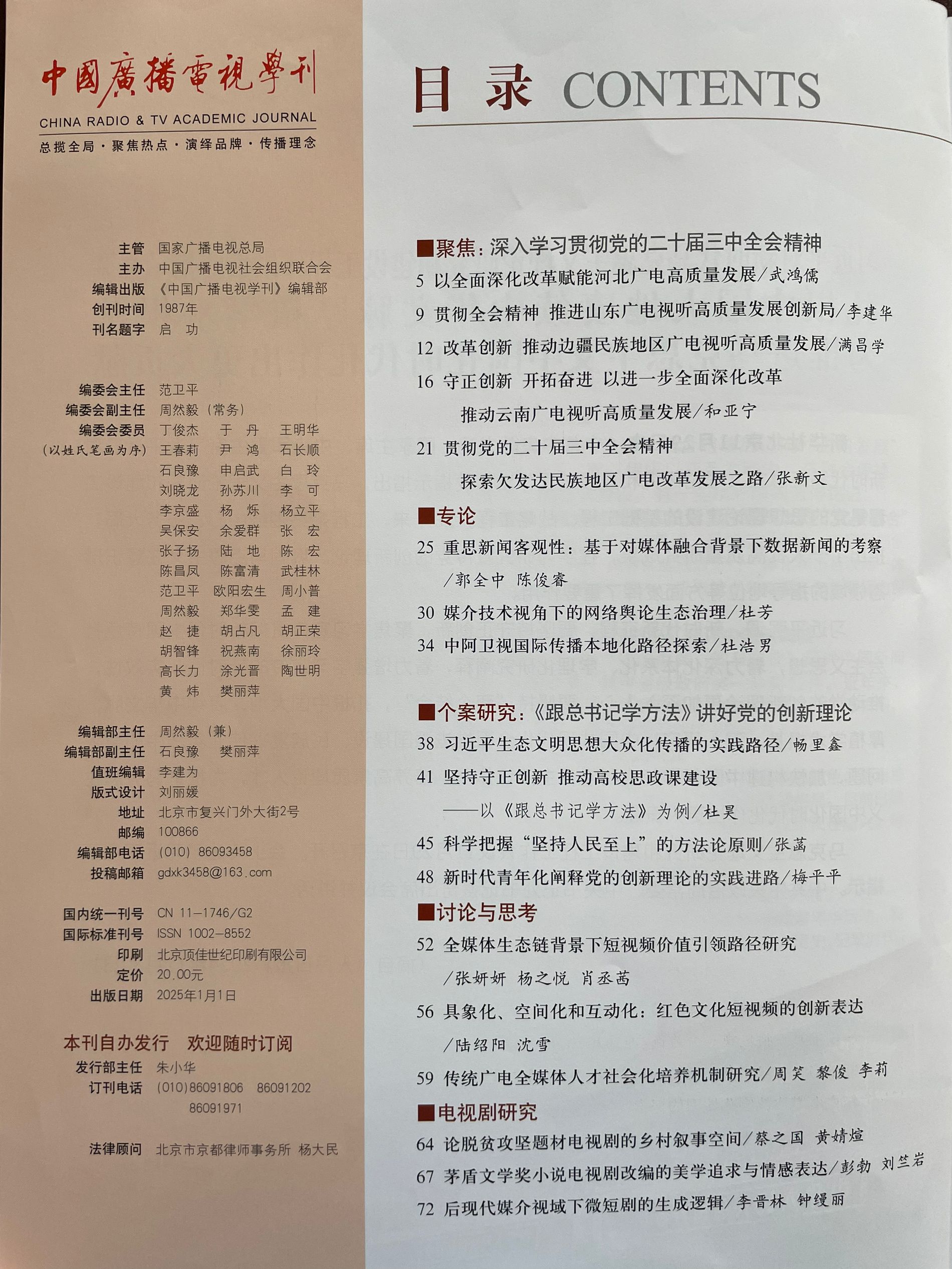 《中国广播电视学刊》创刊于1987年,是由国家广播电影电视总局主管,中国广播电视学会主办的期刊。该期刊设有评论员文章、广电观察、聚焦、局台长论坛、专论、个案研究、讨论与思考、电视就研究、动漫研究、对农广电、征文、专题讲座、地方台论坛、交流之窗、业界动态等栏目。