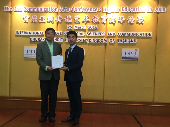 3月26、27日,我院黄元文董事长、罗共和院长受邀赴泰国出席“首届亚洲传媒艺术教育高峰论坛”,并作主题报告。此行,四川电影电视学院与泰国博仁大学签订了合作备忘录。