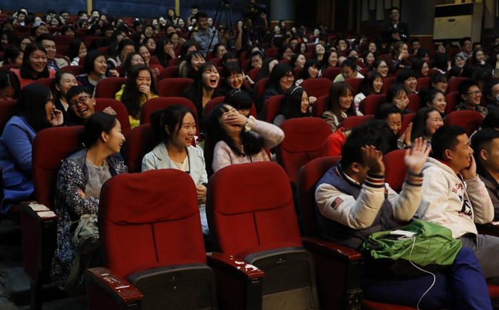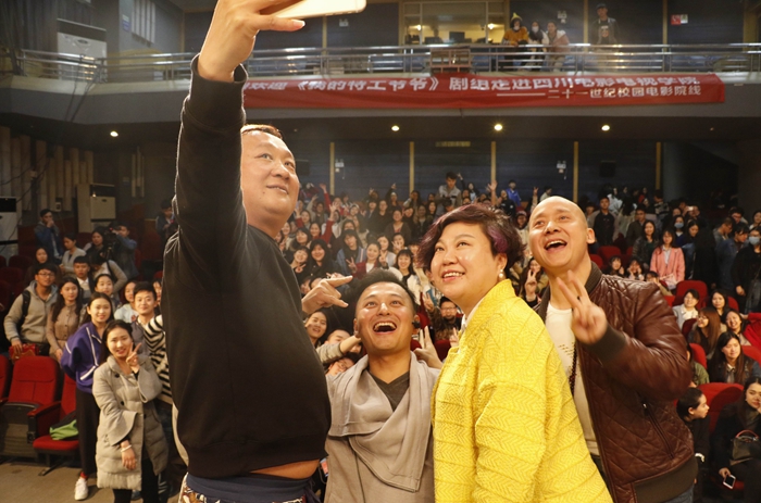 令人意想不到的是,4位“大神级”喜剧明星非常谦虚,让人感受到他们优秀的品质。他们表示,四川电影电视学院的学生对待专业十分认真刻苦,是四川影视未来的希望,经验重要,创新更重要,川影学生的脑子灵活,将成为四川文化推向全国的领军人物。希望学生们能够提出宝贵意见,在以后的电影创作中吸纳一部分学生共同做电影,还包括新媒体。并现场将所有同学加入微信群,希望同学们能在剧本创作等方面献策献力,将学生的新思维与老一辈的经验相结合,“有这么一群聪明的学生作支撑,我们很有信心”,胖姐如是说。