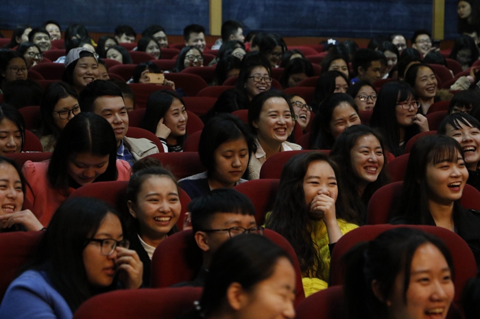 有同学问到喜剧演员戏里戏外不同的状态时,一向搞笑风趣的闵天浩表示,喜剧演员都是AB面的,在台上为大家带来多少欢乐,在台下就付出了多少艰辛。同学们用热烈的掌声为他们的付出表达了敬意。