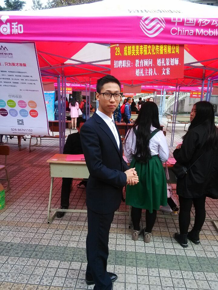 廖燚山,播音与主持专业,他这次的目标是应聘婚礼主持。他说,一直以来,婚礼主持就是我最大的兴趣,而且有丰富的工作经验,大学期间一直兼职做婚庆主持,“会想各种新鲜的花样、语言加入到主持风格中,看着新人们因为自己的创新,整场婚礼更加圆满,为他们一生最美好的回忆做好服务,心里也很开心”,廖同学在应聘时如是说。并且通过了解,他认为投递的这家单位能给自己带来意向不到的收获。经过简单的交流后,廖燚山同学顺利取得最后面试的资格,用人单位对他整体很满意。