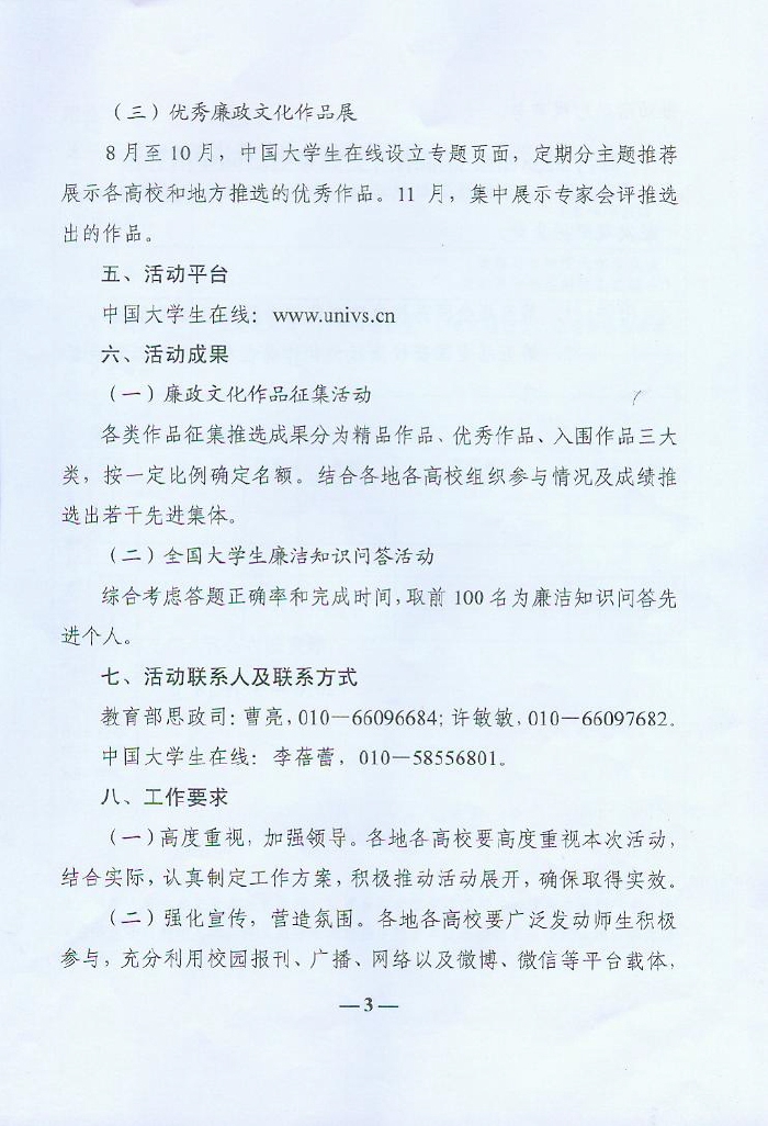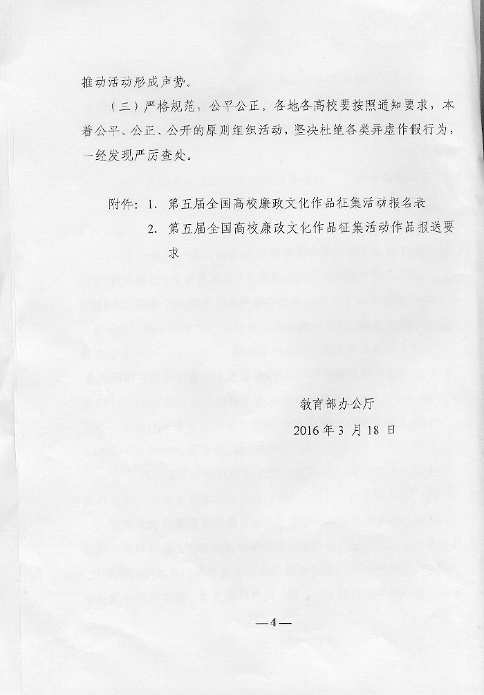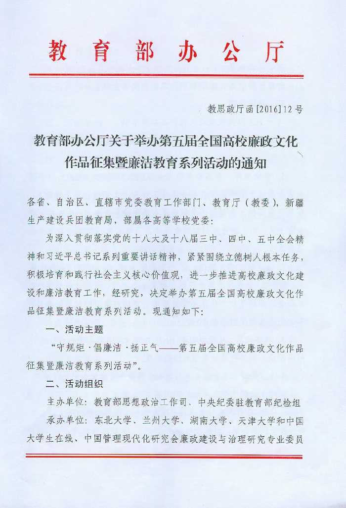 教育部办公厅关于举办第五届全国高校廉政文化作品征集暨廉洁教育系列活动的通知