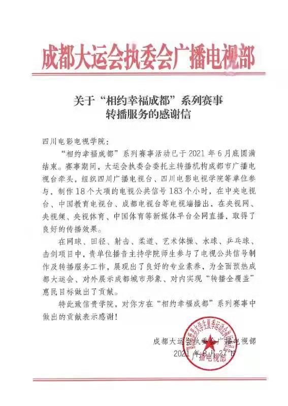 这些青涩的身影就是来自四川电影电视学院播音主持学院高摄班的160名学生,他们亲身参与了“相约幸福成都”系列赛事活动的电视端转播工作。在网球、田径、射击、柔道、艺术体操、水球、乒乓球、击剑项目中,播主学院高摄班的师生都参与了电视公共信号制作及转播服务工作,并展现了较高的专业素养。为此,成都大运会执委会广播电视部向我校播音主持学院发来了感谢信。