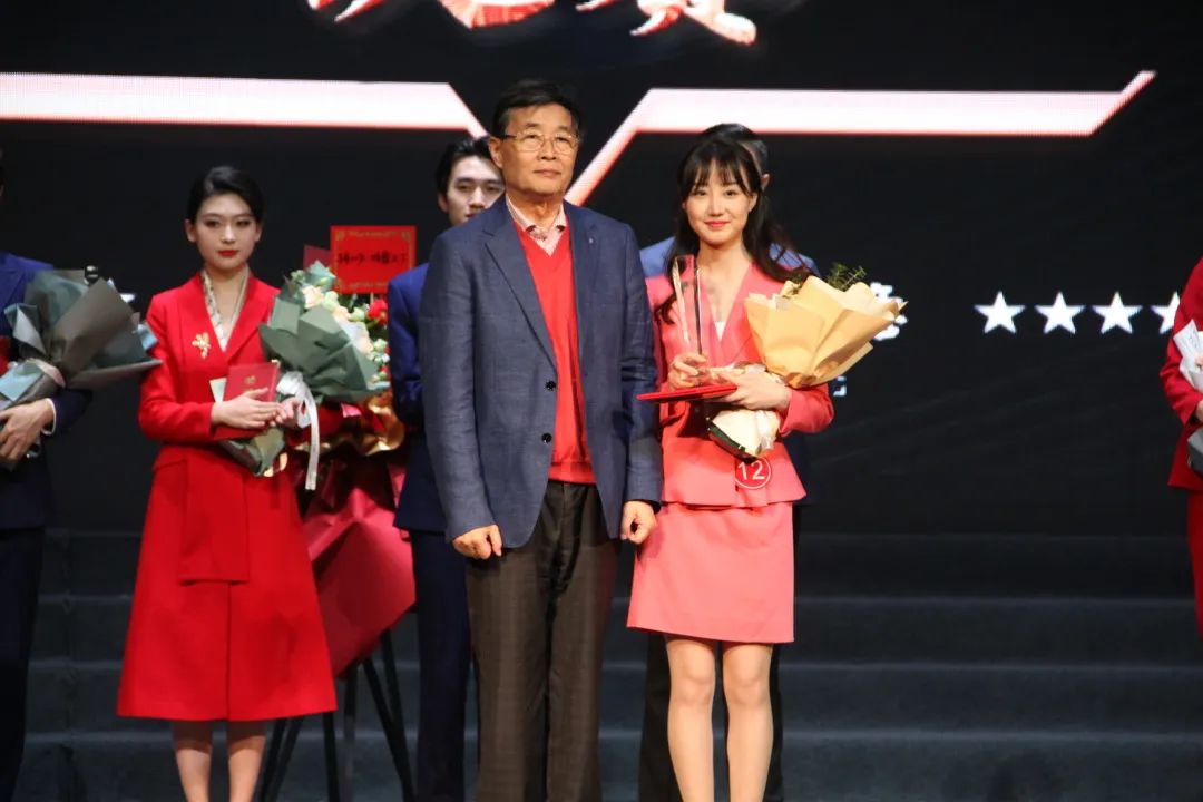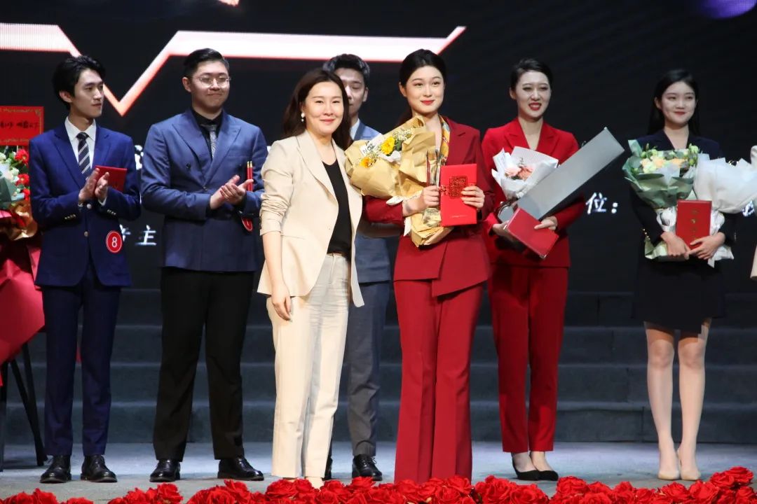 (播音主持学院党委书记、副院长李丹教授给选手颁奖并合影留念)
