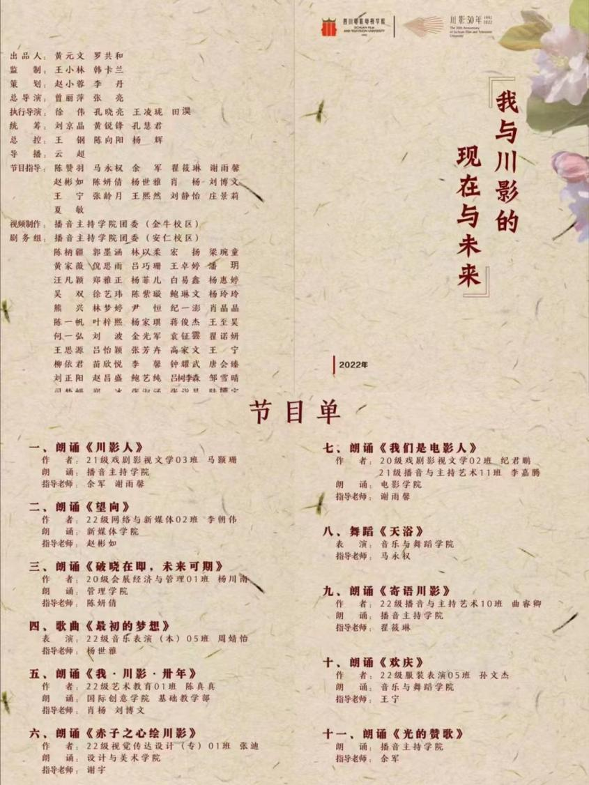 “于历史中探寻未来,在诗词里感悟川影”。在川影建校三十周年之际,为加强学生对川影的深入了解,传承学校优良校风,营造积极进取、共同提高的校园氛围,由四川电影电视学院主办、播音主持学院承办、安仁校区各院系师生共同参与创排的川影三十周年校庆系列活动——“我与川影的现在与未来”散文诗朗诵会,于11月24日晚在安仁校区贡院大剧院正式拉开帷幕。四川电影电视学院党委副书记、学生处处长韩卡兰,党委组织部部长、工会副主席刘国富,武装保卫处处长陈召平莅临本次活动。各院系领导、专业教师及辅导员老师参加。