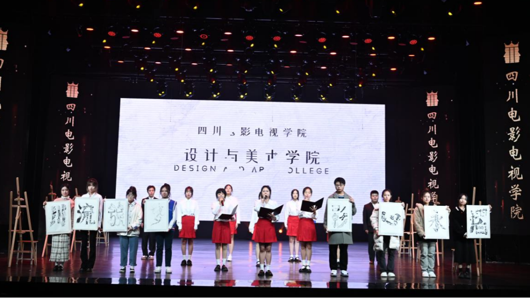 设计与美术学院学子支起画板、拿起画笔、发挥专长,将文字与绘画结合。在朗诵《赤子之心绘川影》的同时在画纸上绘出“川流簇梦,影心永熠”几字,用独特视角笔绘川影,用笔尖勾勒青春,以巧思塑造未来。