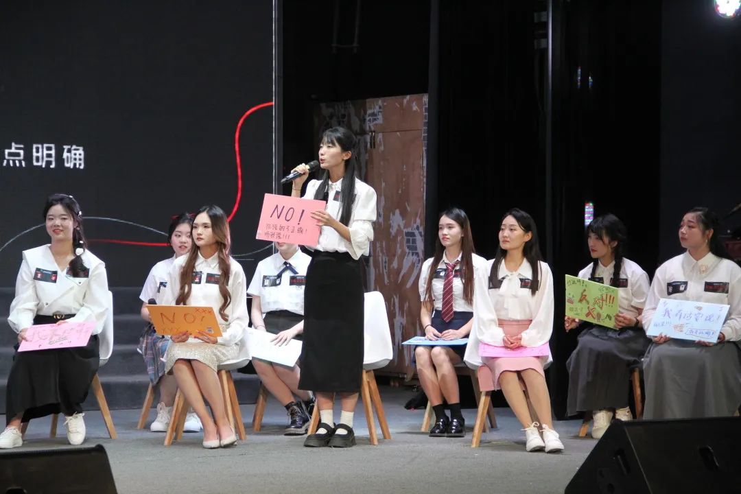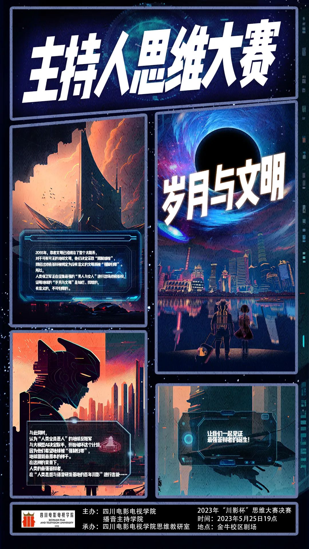 在比赛开始之前,思维教研室主任、比赛总导演韩辉老师和徐雅琴老师共同为选手和观众介绍了本次思维大赛的新亮点和新创意:最大的亮点就是别开生面的引入了“沉浸式”、“剧本杀”、“科幻剧”等元素,将比赛假定为70年后的2093年在百年川影举办的一场人类最强答辩者的选拔,让选手用语言的魅力、真实的行动去证明地球的“岁月与文明”是灿烂、辉煌的,有意义的,不可归零的。总决赛在《保住文明最后的岁月!》的朗诵中激情开场,这场比赛是一场对岁月与文明的探索,人类价值的升华,个性魅力的展现。本次大赛总共分为三轮角逐分别是:过去与文明、未来与岁月、岁月与文明。