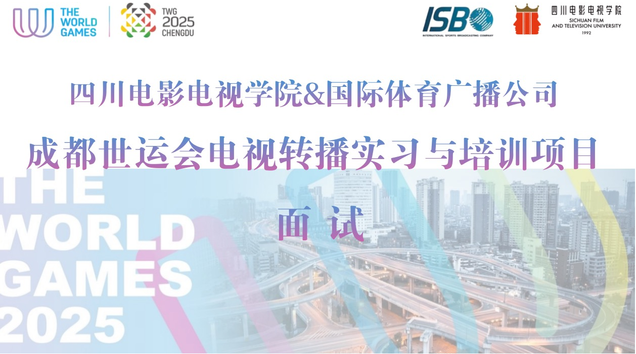 2025年成都世界运动会(The World Games 2025 Chengdu)于8月7日至8月17日在成都举办。3月25日,世界运动会主转播机构国际体育广播公司(ISB)首席执行官乌苏拉・罗梅罗(Ursula Romero)女士一行与学院达成合作协议,选拔130名专业能力强、职业素养高、英语能力好的学生和优秀教师参加世运会的电视转播和团队运营工作。2025年6月,四川电影电视学院开展了成都世运会电视转播实习与培训项目人才选拔的面试工作,在为世运会输送优质人才的同时,也为学生提供国际化的专业实践机会;通过高标准、严要求的选拔流程,为国际体育赛事培养专业、优秀的转播人才,助力学生们在专业领域快速成长。获得实习岗位的学生在7月参加国际广播公司ISB的岗前培训,并全方位参与成都世运会的电视转播工作。