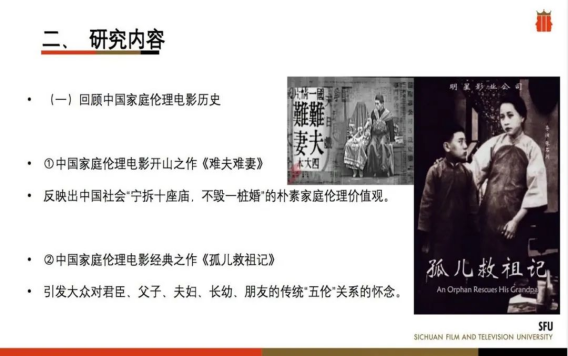 苏丹老师的发言主要就家庭伦理电影的发展与流变展开。研究首先介绍了中国家庭伦理电影的发展历史,然后就家庭伦理电影中所体现的两性伦理、生活伦理、工作伦理进行了细致分析。研究认为,中国家庭伦理电影不仅继承和发扬了中华传统文化中的伦理观念与家国情怀,更为传统伦理观念赋予了新的时代内涵,成为观察当代社会思潮和大众文化的一种影像路径。