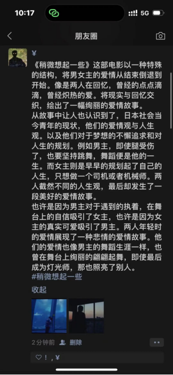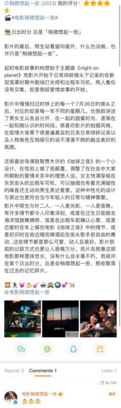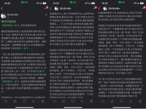 在此次观影动结束后,大家对影片风格进行讨论,思考宣发实践中的思路。影片平静流淌的日常画面、不疾不徐的叙事节奏以及细致入微的情感刻画都透露着“日式”风味,学生们都表示感受颇深,觉得这就是现实中爱情的样子,可谓是“后劲十足“。参与活动的每个学生都以不同形式,在抖音、微博、小红书、朋友圈等社交平台围绕这部电影发表了自己看法与感受,进行电影宣发课程的首次实践。