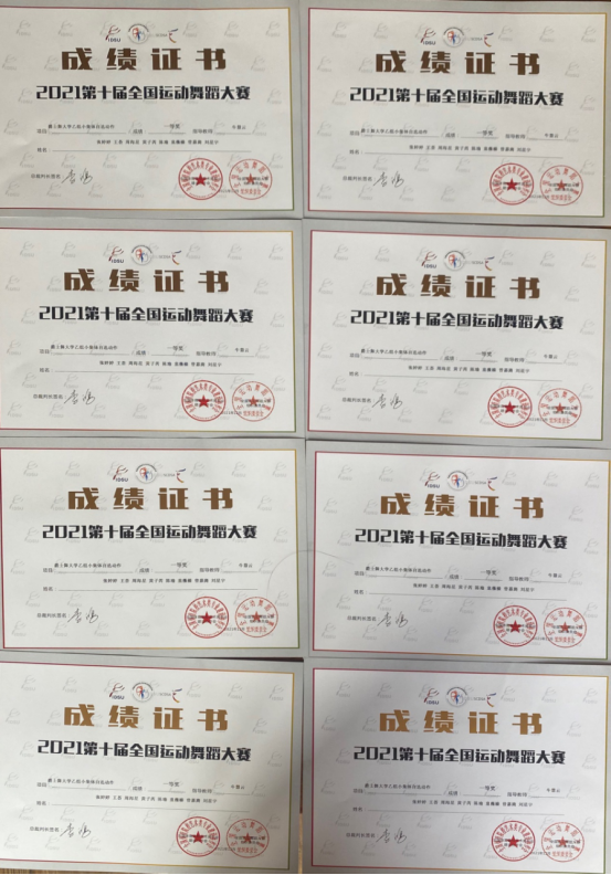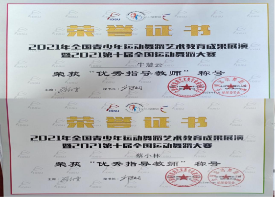 我校组织学生参与的“2021年全国青少年运动舞蹈艺术教育成果展演”暨“2021第十届全国运动舞蹈大赛” 取得了爵士舞、街舞大学组一等奖的优秀成绩,带队教师牛慧云、蔡小林获得“优秀指导老师”称号。