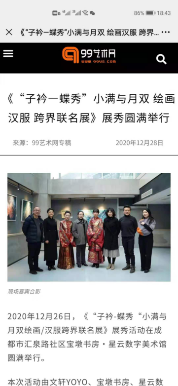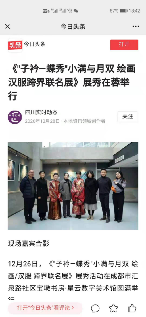 2020年,薛满利老师和杨月双老师受成都星云数字美术馆与文轩YOYO之邀举办的“子衿-蝶秀”绘画+童模汉服秀联展,老师们让学生贯穿到整个展秀实践中,提供了积极的社会实践机会。取得良好的社会评价。《成都商报红星新闻网》、《今日头条》、《艺术头条》、《99艺术网》等行业主流媒体均进行了正面报道。特别是《今日头条》上载了学生们在后台为童模进行服化造型的图片报导。