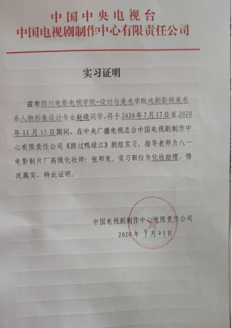 在2020年7月-12月,本专业学生赵晓、胡嘉龙等8人在中央电视台中国电视剧制作中心有限公司承制的《跨过鸭绿江》剧组中担任化妆工作。