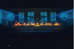 “云之上” 剧场外墙瓦用了近60万片蓝绿色、白色、灰色玻璃瓦和陶瓦按“千里江山图”的意境组成的混合幕墙体系,与周边自然环境相融合,像坐落人间的“天上宫阙”。进入“云之上”剧场,如同置身峨眉山金顶的云海之上,看一看千年以来从山顶俯瞰的世间万物,一幅关于生命的宏大画卷,也在此时徐徐展开。