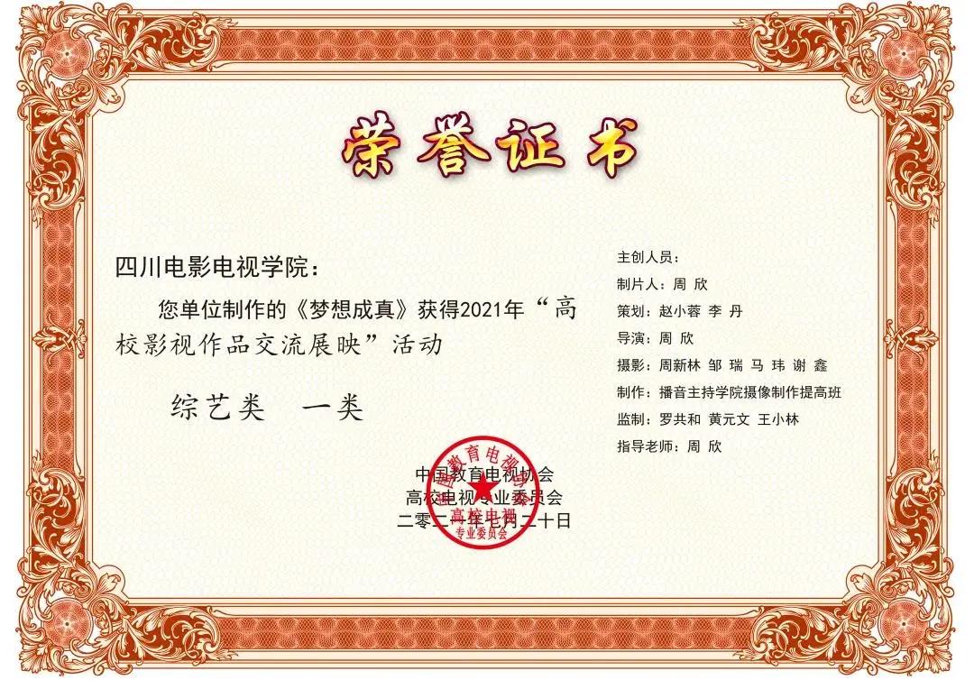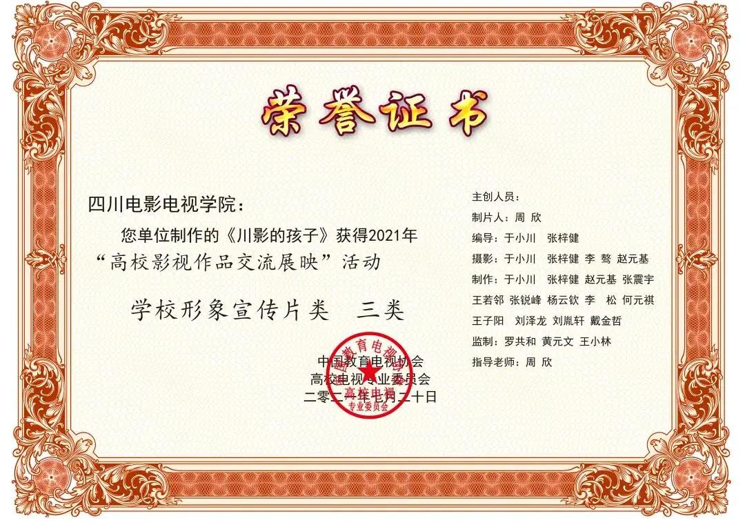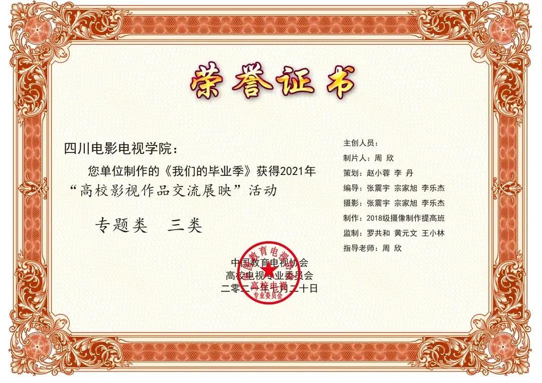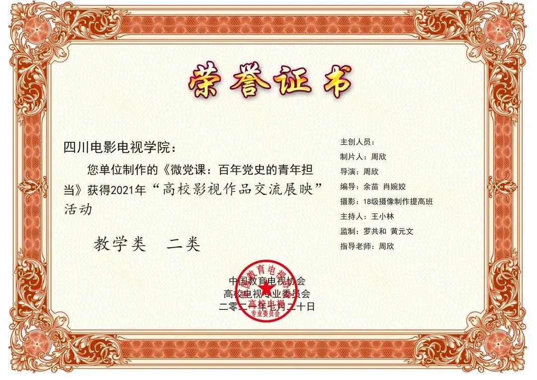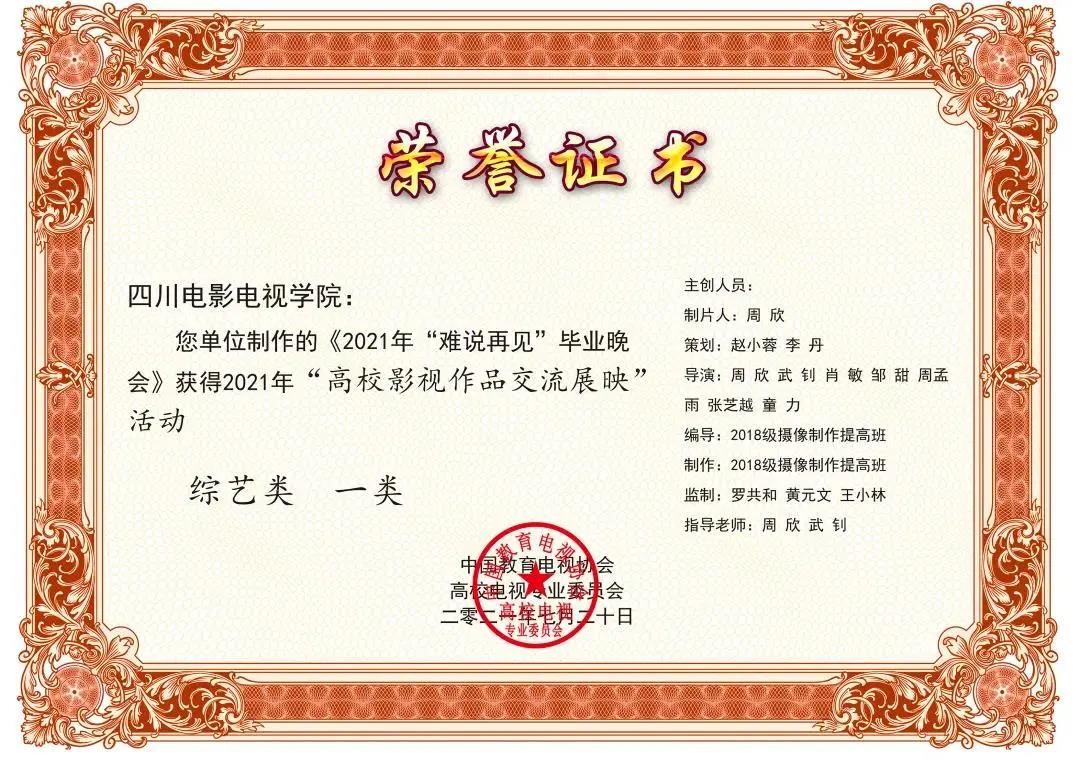四川电影电视学院播音主持学院共提交专题类、教学类、综艺类、学校形象宣传片类等六部作品全部获奖。其中获得一等奖3部、二等奖1部、三等奖2部。“难说再见”毕业晚会连续第六年获得该奖项“综艺类”一等奖。由学校党委办公室余苗、肖婉姣老师担任编导,由党委书记王小林教授担任主讲人的《微党课:百年党史的青年担当》还获“四史”宣传教育题材优秀作品奖。播音主持学院视听传播教研室主任周欣副教授连续六年代表学校参会领奖;09级高摄班班长,青岛西海岸广播电视台主持人苗琳,12级高摄班班长,山东电视台导演刘锦贤参加了大会并代表学校上台领奖。