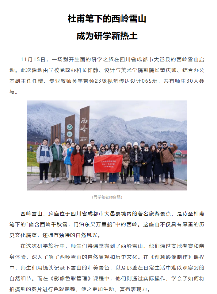 通过这次研学之旅,师生们不仅领略了西岭雪山的自然风光,还对这里的生物多样性有了更深入的了解。同时,他们也通过实地操作,提高了自己的创意影像制作和色彩管理能力。这些都将对他们今后的学习和工作产生积极的影响。