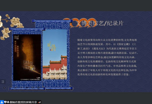 本次讲座主要围绕着文物传承与创新展开,从文博类节目的演变、数字技术的应用、文创产品开发、文物网络再现四个方面,为我们展示了在现代科学技术下文物的魅力。让人们能充分认识中国文物具有雄厚的底蕴和价值,使人们能更加重视中国文物,并传承和发扬光大。