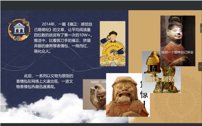 本次线上讲座受到了同学们的热烈欢迎,谢婉若教授向同学们分享了自己对文物的传承与创新的看法,告诉同学们在进行文创产品制作时要注重文物的经济价值、文化传承、文化自信三个方面。讲座期间,谢婉若教授还给同学们展示了一些文物动起来的小视频,引起了同学们浓厚的学习兴趣。文物本是比较严肃而深沉的,通过传统文物与流行文化的碰撞,让传统文物“活”起来,重新焕发出活力,看起来形象又可爱。虽然这次讲座是通过线上进行的,但同学们的热情也是极高,丝毫掩藏不住讲座的活跃氛围。在此感谢谢婉若教授给同学们带来一场生动有趣的讲座。