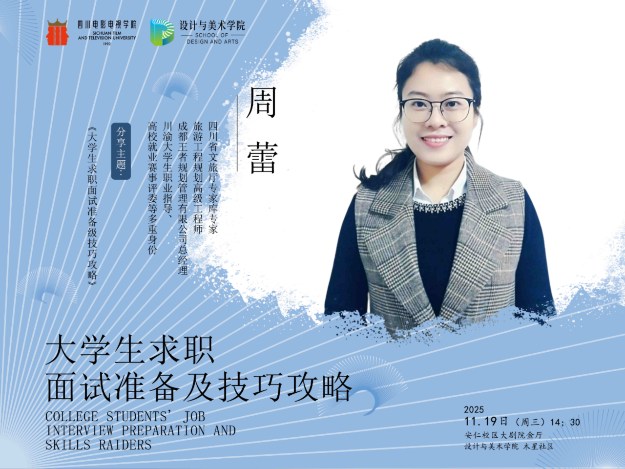 2025年11月19日下午,设计与美术学院与木星社区携手在安仁校区大剧院金厅开展了一场以“大学生求职面试准备及技巧攻略”为主题的讲座。拥有四川省文旅厅专家库专家、旅游工程规划高级工程师、成都王者规划管理有限公司总经理、川渝大学生职业指导、高校就业赛事评委等多重身份的主讲人周蕾老师分析的就业市场现状与讲述的当前求职技巧,让这场“求职必修课”干货满满。
