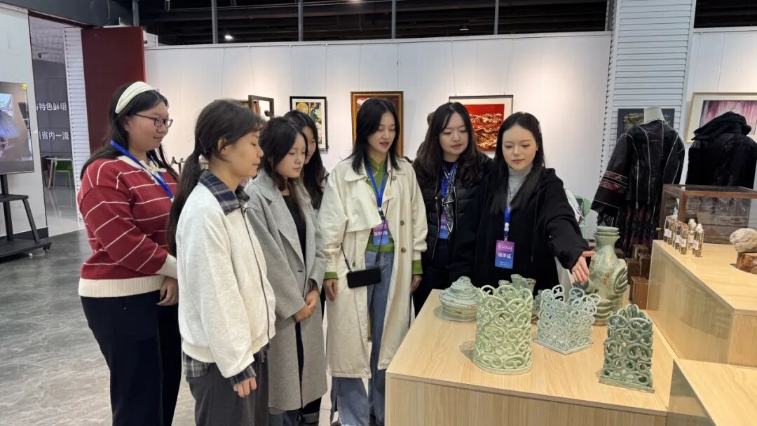 决赛期间,赛事同步举办非遗活态展示与体验活动、高校工艺美术优秀作品展,以及“地域文脉与时代创新:地方工艺美术非遗的特色化发展与探索”研讨会等环节,为参赛师生搭建了宝贵的学习交流平台。在高校工艺美术优秀作品展中,我院学子现场讲解自己的获奖作品,充分展现出深厚的专业素养与突出的创新能力。