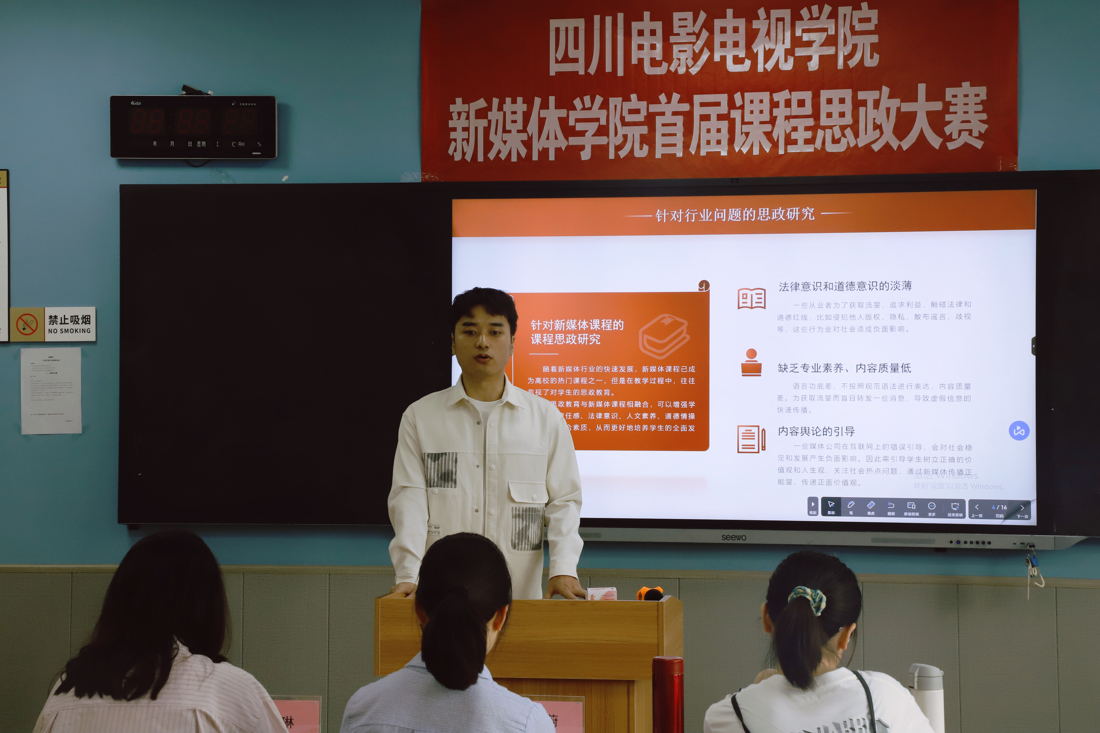 为贯彻落实中共中央办公厅、国务院办公厅《关于深化新时代学校思想政治理论课改革创新的若干意见》《高等学校课程思政建设指导纲要》文件精神,根据《四川电影电视学院关于推进“课程思政”建设的实施意见》《四川电影电视学院课程思政教育教学改革实施方案》要求,落实立德树人根本任务,深化课程思政教学改革,充分发挥课程思政育人功能,提高人才培养质量,同时献礼建校30周年,新媒体学院在完成各教研室教学大赛初赛的基础上,于4月13日9:30至4月13日15:35,在闻院305举行了课程思政教学大赛复赛。