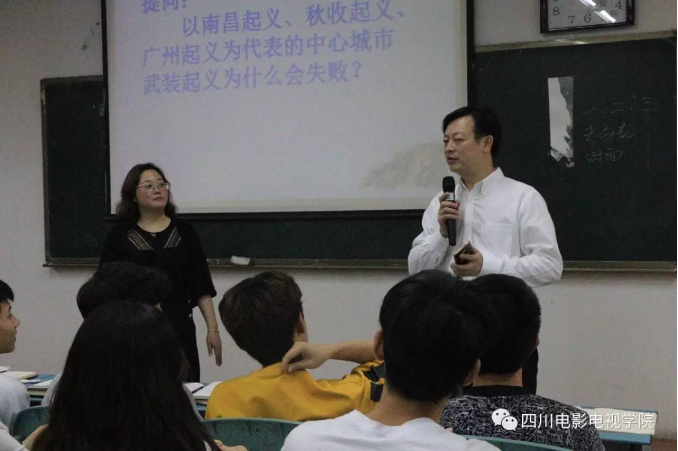 随后,高中伟教授一行来到翰院314教室进行随堂听课。314教室内张代芬老师正在为16级表演一班讲授《中国共产党探索中国革命道路的艰辛历程》,张老师用生动的语言、丰富的表情、饱满的激情为同学们讲述那个历史时期波澜壮阔的场面。同学们听得津津有味。当讲到历史上著名的“刑场上的婚礼”时,两名同学走上讲台,扮演起了主人公周文雍和陈铁军,将那一幕感人场面生动地呈现给在场所有人,赢得了一片掌声。