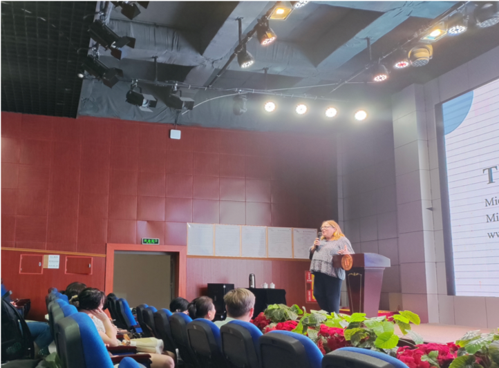 随后,普莱桑斯教授对此问题做主题演讲。作为TESOL(Teaching English to Speakers of Other Languages, 对非英语母语者进行英语教学)领域的专家,普莱桑斯教授向川影的英语老师们介绍了当前在该学科中的三个议题。一是技术对教学过程、学习结果、教学手段的影响,她总结道,一定的技术在适当使用的基础上会大幅提高教学结果,但同时也需要考虑到学习和技术之间主次关系的转化。二是在教育学中已经成为多年热点话题的CBL(Content-based learning, 内容为基础的学习), PBL(Problem-based learning, 问题为基础的学习)及更多更新衍生术语之间的核心诉求:以学生为中心,结果和输出导向。在这种教学范式下,教师对学生的认知、语言文化、材料内容和沟通技能都需要有监控和引导,才能达到“以真实的语言环境为学习场域,解决生活中实际问题,学生为主体,教师辅助”的要求。三是介绍了术语translanguaging(跨语言):与我们往常的直觉思考不同,在外语学习的过程中,灵活交替地使用母语和目标语言其实是有益于语言习得的。普莱桑斯教授演讲完毕后,现场的老师们踊跃提问。