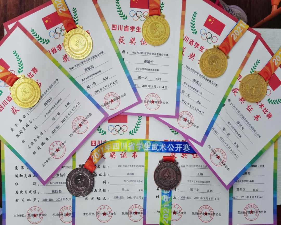 比赛期间,我校运动员发扬顽强拼搏、团结协作的精神,展现出川影运动健儿良好的精神风貌和较高的竞技水平,充分体现了中华武术的“精、气、神”,在大学甲组比赛中一举斩获5金1银1铜的佳绩。其中,武术队队长秦兴元,荣获形意拳冠军、双刀冠军;19级数字媒体艺术1班路靖怡,荣获太极拳冠军、太极剑冠军;20级舞蹈表演1班黄鸿栩在传统南拳和长器械中荣获1金1银;19级数字媒体艺术1班王络获得铜牌。