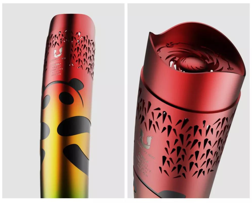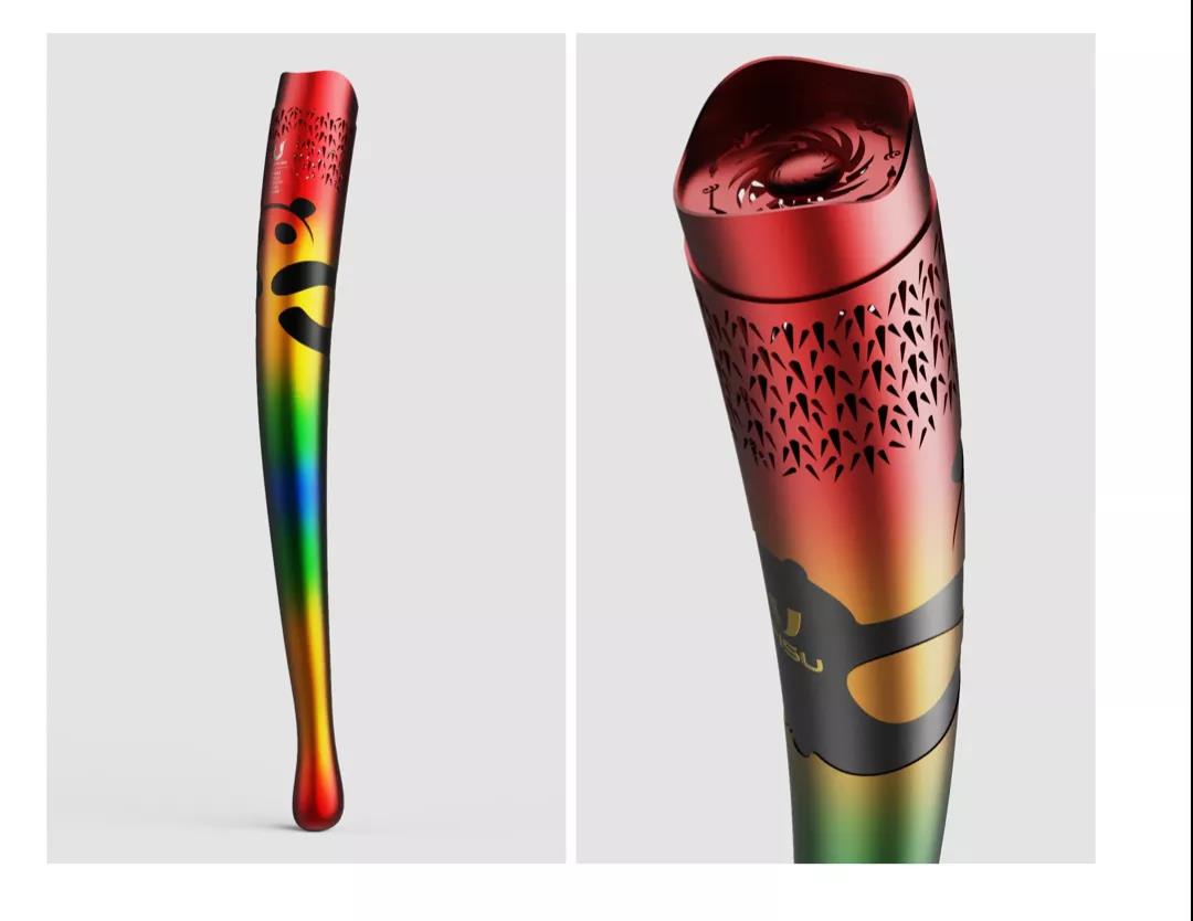 火炬正面以国际超级IP、四川“活化石”——大熊猫为主元素,展现热情奔放、乐观包容的文化态度;火炬顶部是成都城市形象标识、中国文化遗产标志——太阳神鸟,在淬火中展开理想的弧度,勇敢追求光明;火炬侧面犹似三星堆青铜立人造型致敬古蜀文明,上端口的竹叶孔造型既满足火焰的进气需求,又与大熊猫完美融合。