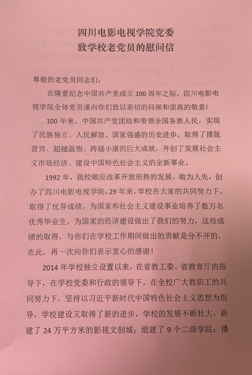 四川电影电视学院党委致学校老党员的慰问信