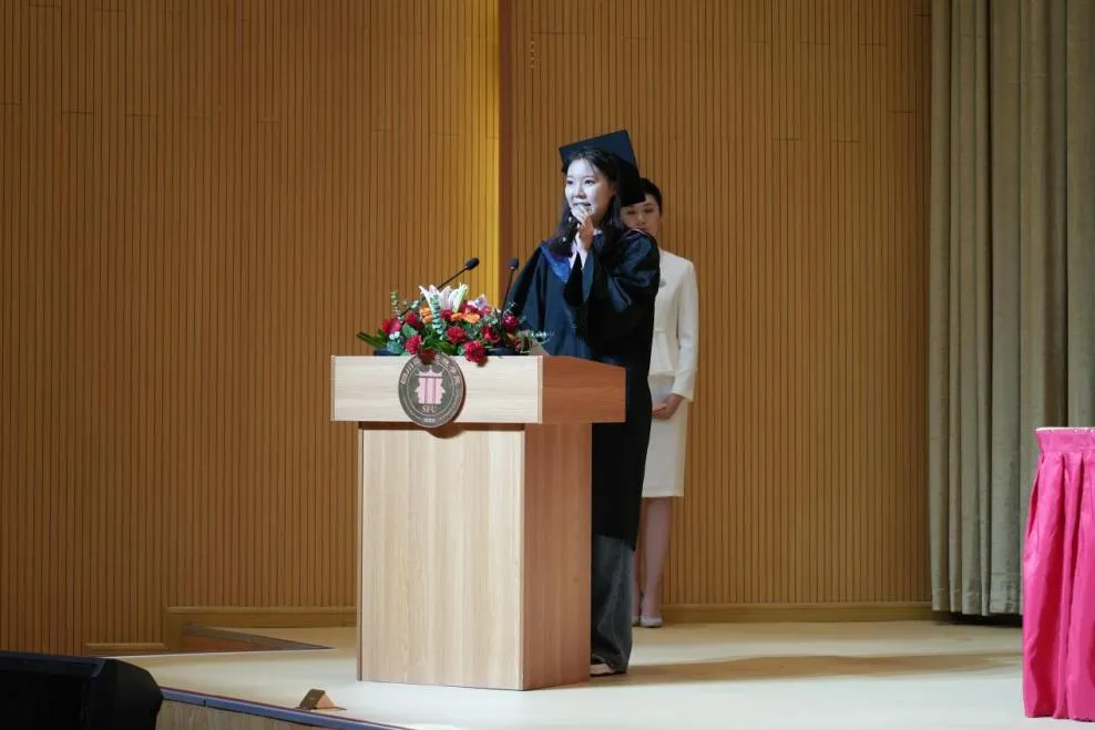 优秀毕业生代表20级音乐表演(本)01班王亚楠感叹四年时光如水,表达了对母校的热爱、对父母的感恩、对师友的不舍。并表示踏上新的征程之后,将砥砺奋斗,力争成为具有社会责任感、创新精神的卓越人才,书写属于自己的青春篇章。