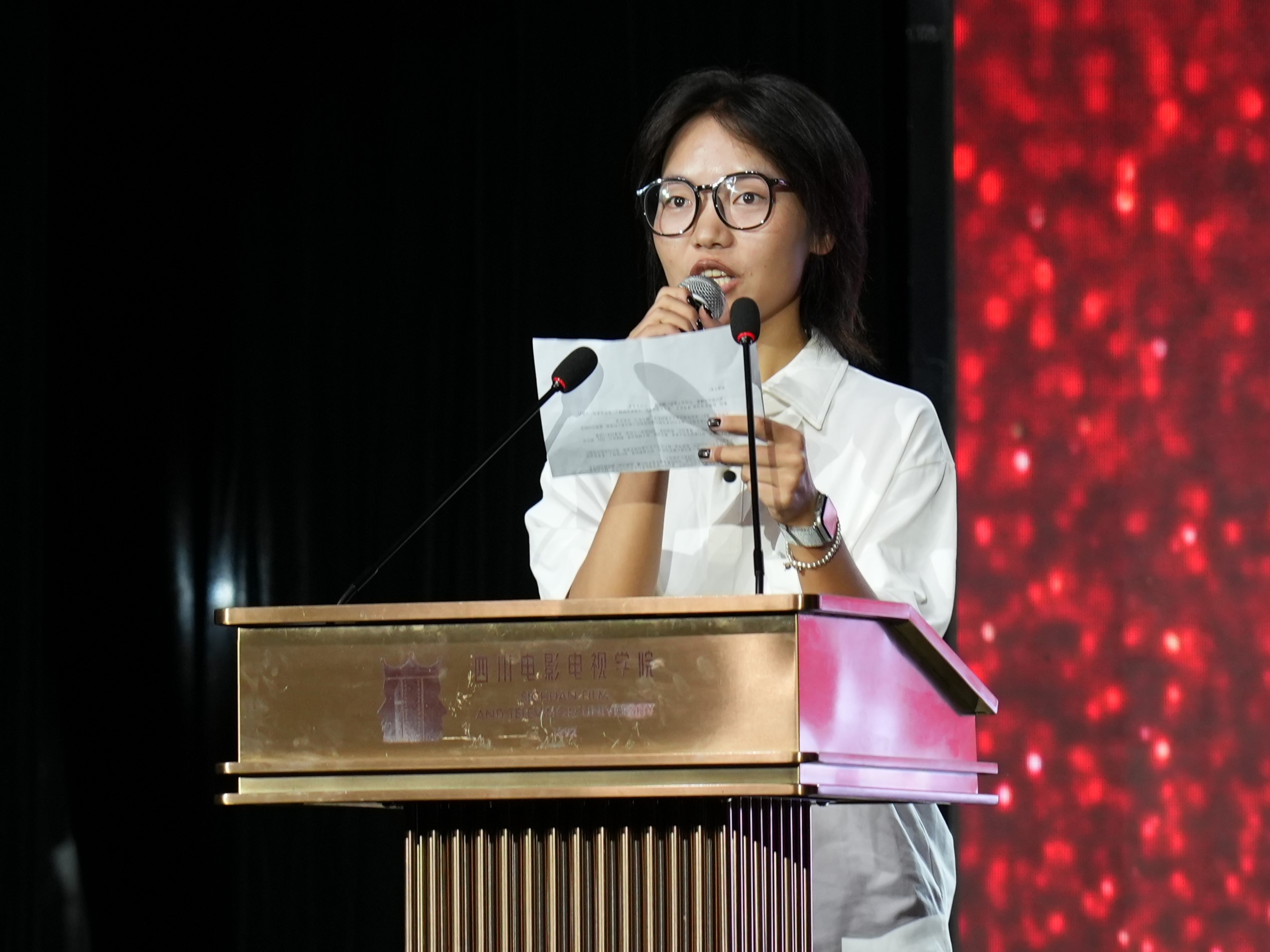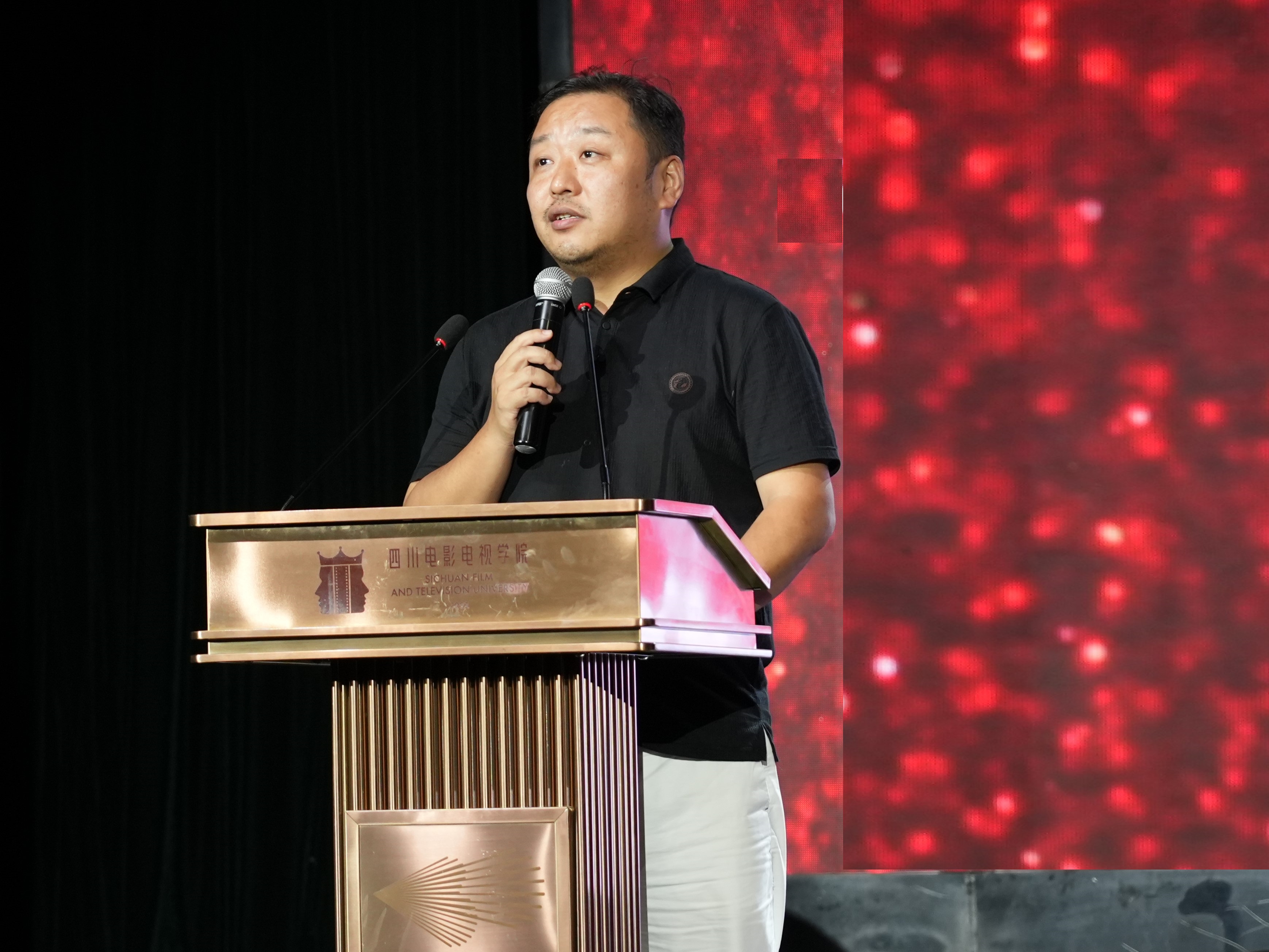 院长李兵教授代表音乐学院对全体新生表示祝贺和欢迎,并对同学们寄语了三段话。首先,他强调了一所优秀大学应具备的四个基本要素:美丽的校园环境、严谨的治学态度、优秀的教师团队以及全心全意为学生服务的理念。他提到,同学们已经亲身体验到了校园的魅力,其余三项也即将体会到。因此,我们四川电影电视学院就是优秀的大学,音乐学院当然也是!