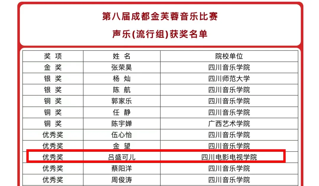 作为一名刚刚加入川影音乐学院的年轻教师,吕盛可儿在决赛中,以其极具爆发力的嗓音和浓烈的情感演唱了英文歌曲《I'll never love again》,获得声乐(流行组)优秀奖。