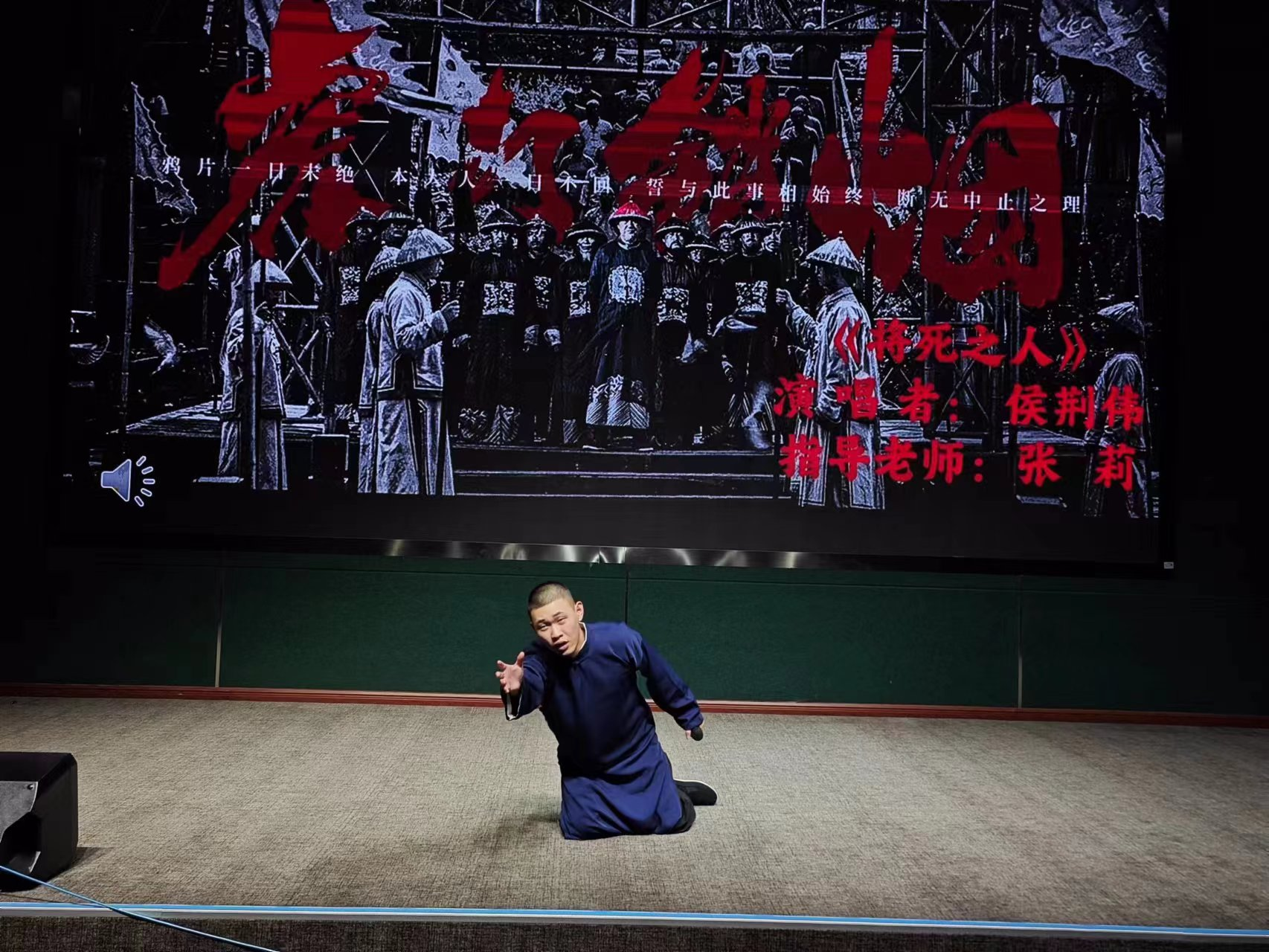 侯荆伟同学的演唱曲目是音乐剧《虎门销烟唱段》——《将死之人》,他的表演从外部形态的演绎到人物内部情感的表达都非常到位,演唱层层递进,情绪爆发酣畅淋漓。
