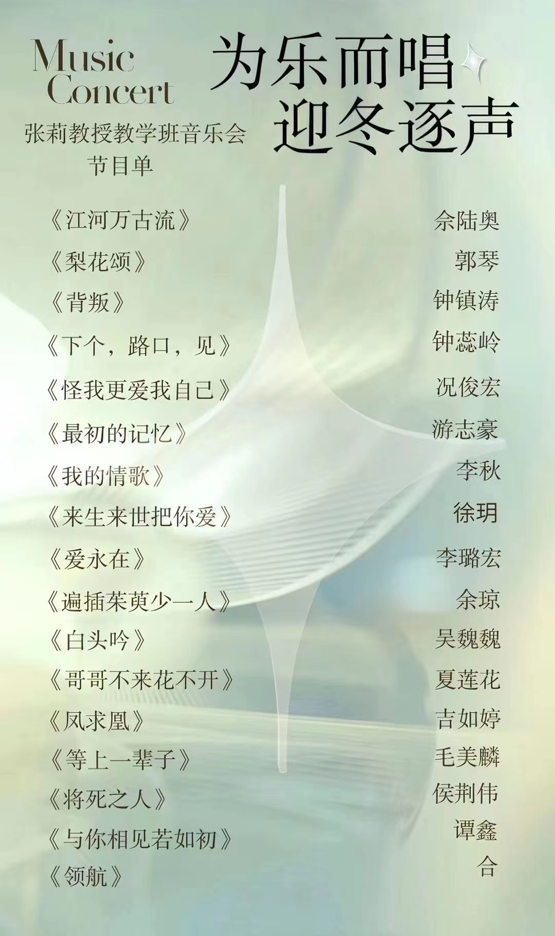 11月29日,音乐与舞蹈学院音乐系张莉教授教学班“为乐而唱,迎冬逐声”主题音乐会在学校绿厅拉开了帷幕。本次音乐会不仅是对同学们一学期学习成果的检验,更是一次非常宝贵的舞台实践机会。热爱是所有的理由和答案,张莉教授和教学班的同学们,用热爱和歌声温暖了这个寒冷冬夜。