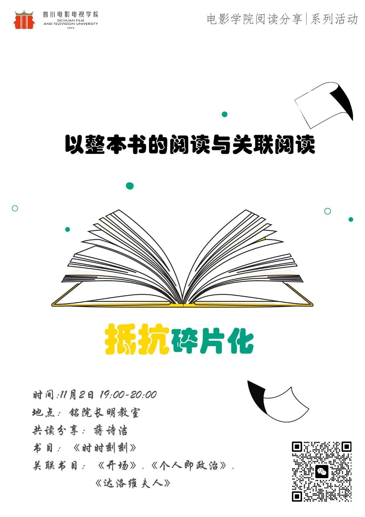“本次读书会的主题缘于本学期课上与大家分享有关互联网对人思维模式的影响,碎片化、标签化、取消深度......” “在一个读3000字以上都会告诉你阅读时长的年代,我们是否会简单化的理解文学作品中的人物。例如罗伯特·詹姆斯·沃勒《廊桥遗梦》中的Francesca,她是个什么样的人;福楼拜《包法利夫人》中的艾玛·包...