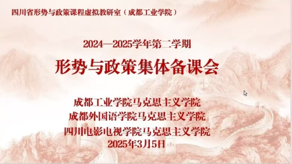 马院教师参加2025年第二期“形势与政策”课云端集体备课会 为深入贯彻落实习近平总书记2024年5月11日关于思政课建设的重要指示精神,切实提升我校形势与政策课教学实效,在“四川省形势与政策课程虚拟教研室”组织下,3月5日,我院教师积极参加2025年第二期“形势与政策”课云端集体备课会。 本次备课会通过线上平台进...