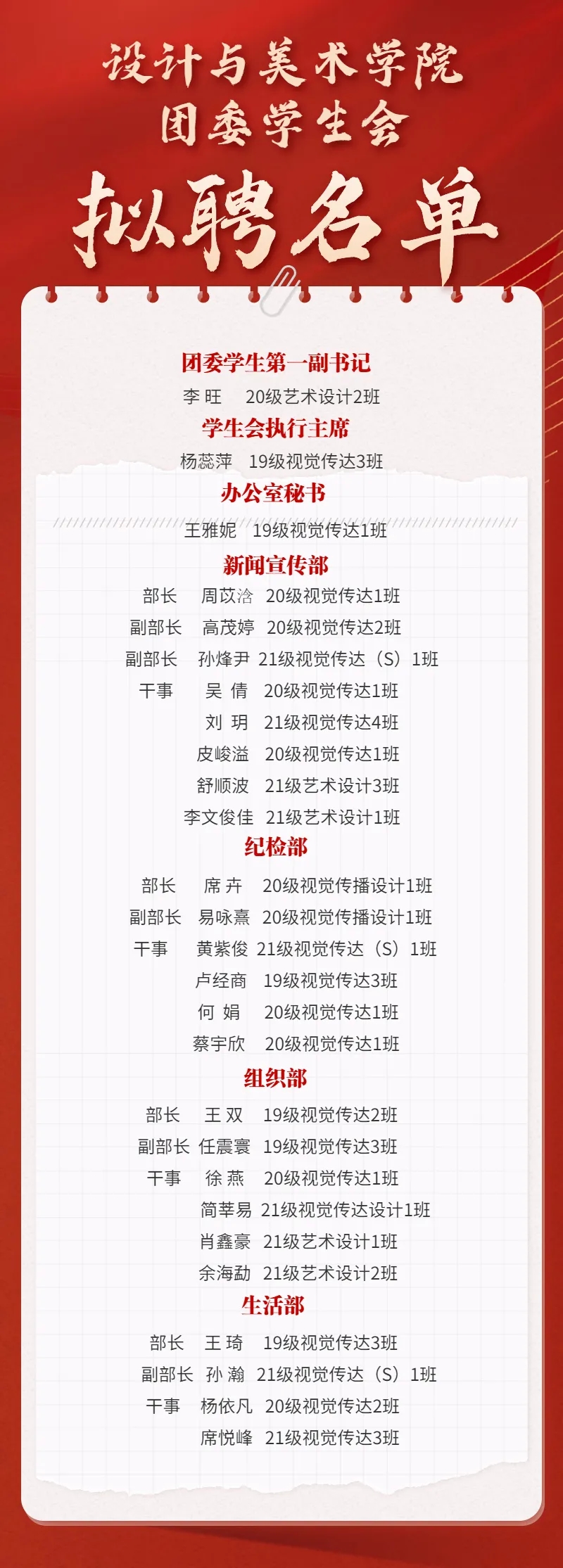 2021年9月2日,四川电影电视学院设计与美术学院的团委学生会举办了一次面向本院全体学生的招新大会。经过学生们的投报简历及面试,以及老师们的商议和选拔,现拟聘各职位的新成员如下名单:招贤纳士为一个部门的必需流程。为团队注入新鲜血液,使团队日益强大也永葆活力。欢迎新成员的加入,相信在全体学生会成员的兢兢...