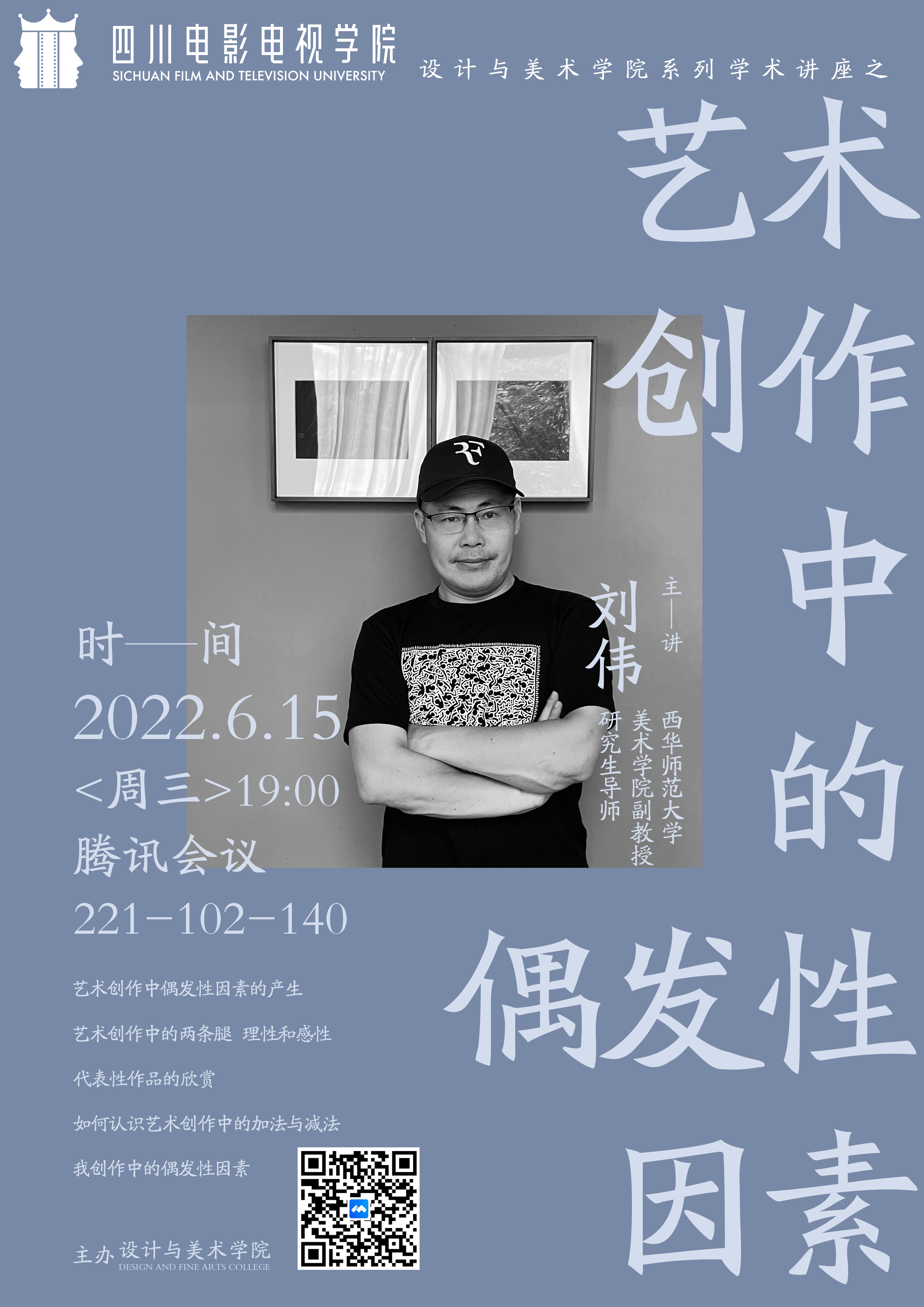 四川电影电视学院设计与美术学院系列讲座主讲人:刘伟讲座题目《艺术创作中的偶发性因素》讲座时间:2022年6月15日19:00腾讯会议:221102140主讲人简介:2005年毕业于四川美术学院油画系获硕士学位;现任职于西华师范大学美术学院 副教授、硕士生导师;2014--2015年中国美术学院学习;现工作生活于四川、重庆。作品参加...