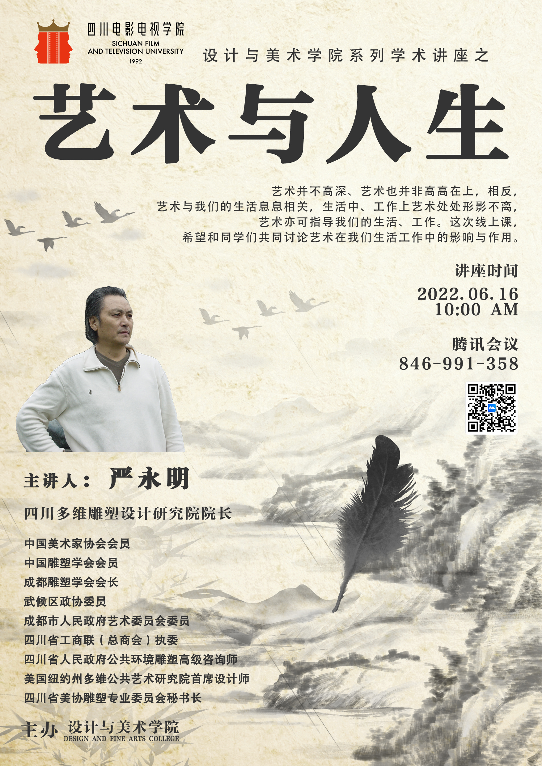四川电影电视学院设计与美术学院系列讲座主讲人:严永明讲座题目《艺术与人生》讲座时间:2022年6月16日10:00腾讯会议:846991358主讲人简介:严永明先生是我国职业雕塑家,国家资格证0545号。现任中国美术家协会会员、中国雕塑学会会员、四川省人民政府公共环境雕塑高级咨询师、美国纽约州多维公共艺术研究院首席设计师...