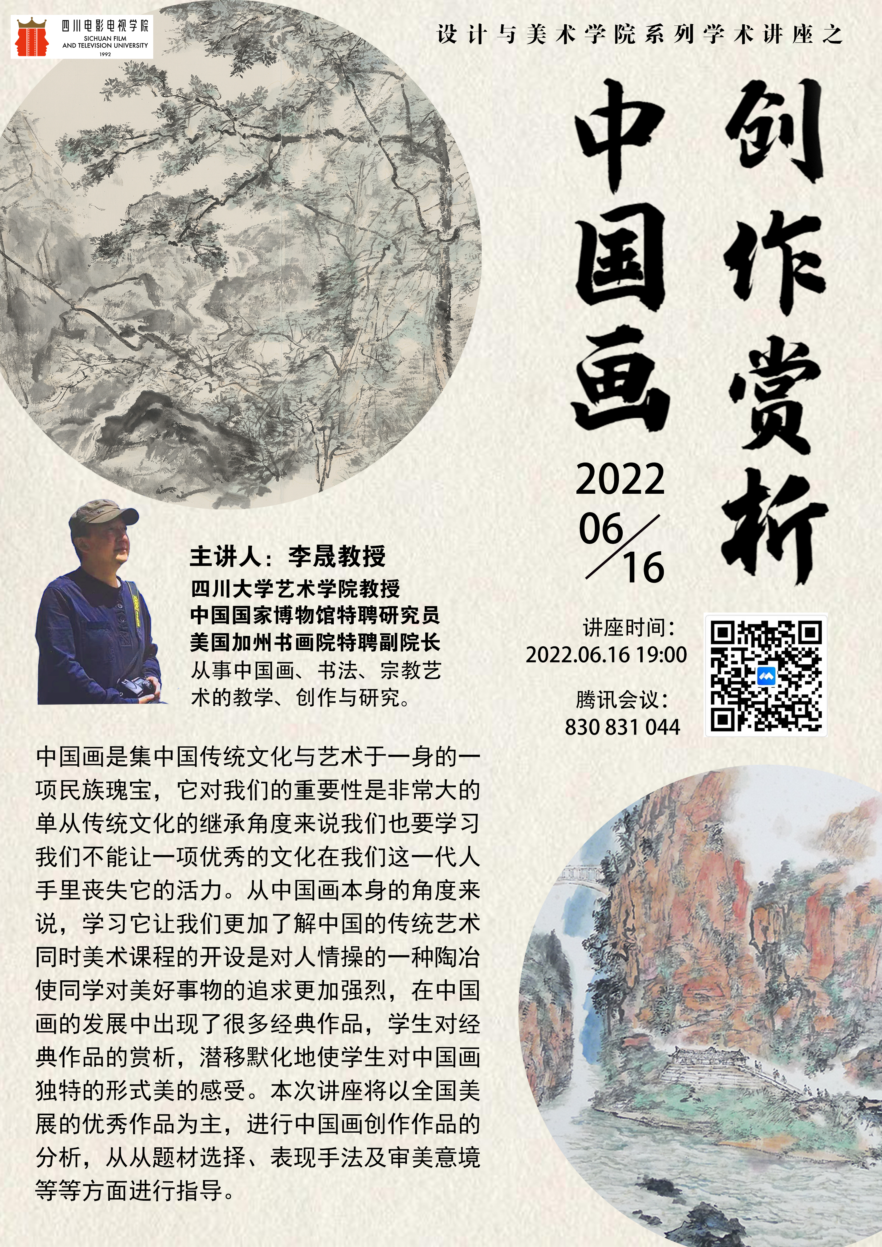 四川电影电视学院设计与美术学院系列讲座主讲人:李晟讲座题目《中国画创作赏析》讲座时间:2022年6月16日19:00腾讯会议:830831044 主讲人简介:四川大学艺术学院教授,博士,硕士研究生导师,主要从事中国画、书法、篆刻、宗教艺术的教学、创作和研究工作。四川美术家协会会员四川书法家协会会员中国国家博物馆特聘...