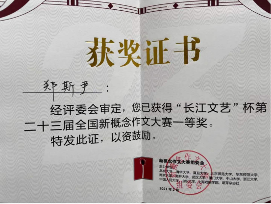 2021年2月,19级广播电视编导1班的郑斯尹同学在“长江文艺杯”第二十三届全国新概念作文大赛中获得了一等奖。