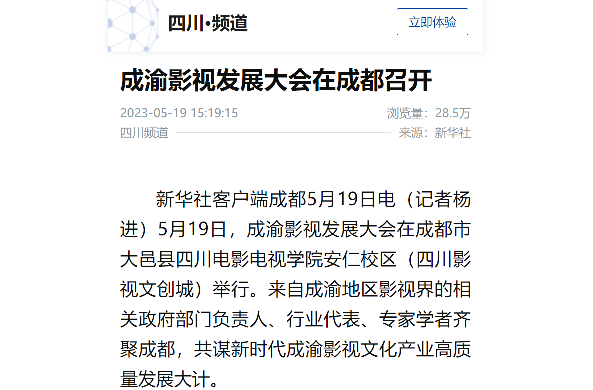 5月19日,成渝影视发展大会在成都市大邑县四川电影电视学院安仁校区(四川影视文创城)举行。来自成渝地区影视界的相关政府部门负责人、行业代表、专家学者齐聚成都,共谋新时代成渝影视文化产业高质量发展大计。