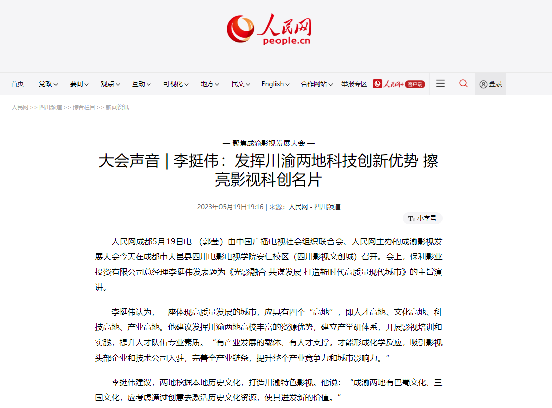 由中国广播电视社会组织联合会、人民网主办的成渝影视发展大会今天在成都市大邑县四川电影电视学院安仁校区(四川影视文创城)召开。会上,保利影业投资有限公司总经理李挺伟发表题为《光影融合 共谋发展 打造新时代高质量现代城市》的主旨演讲。