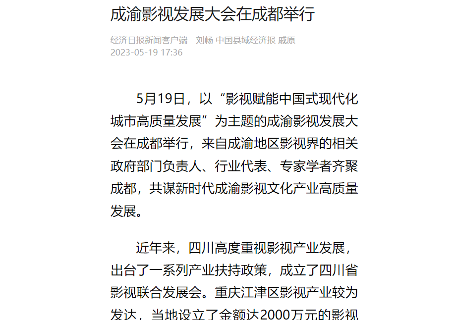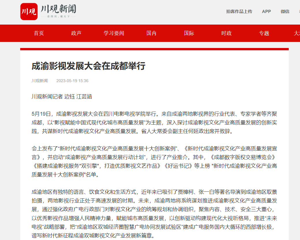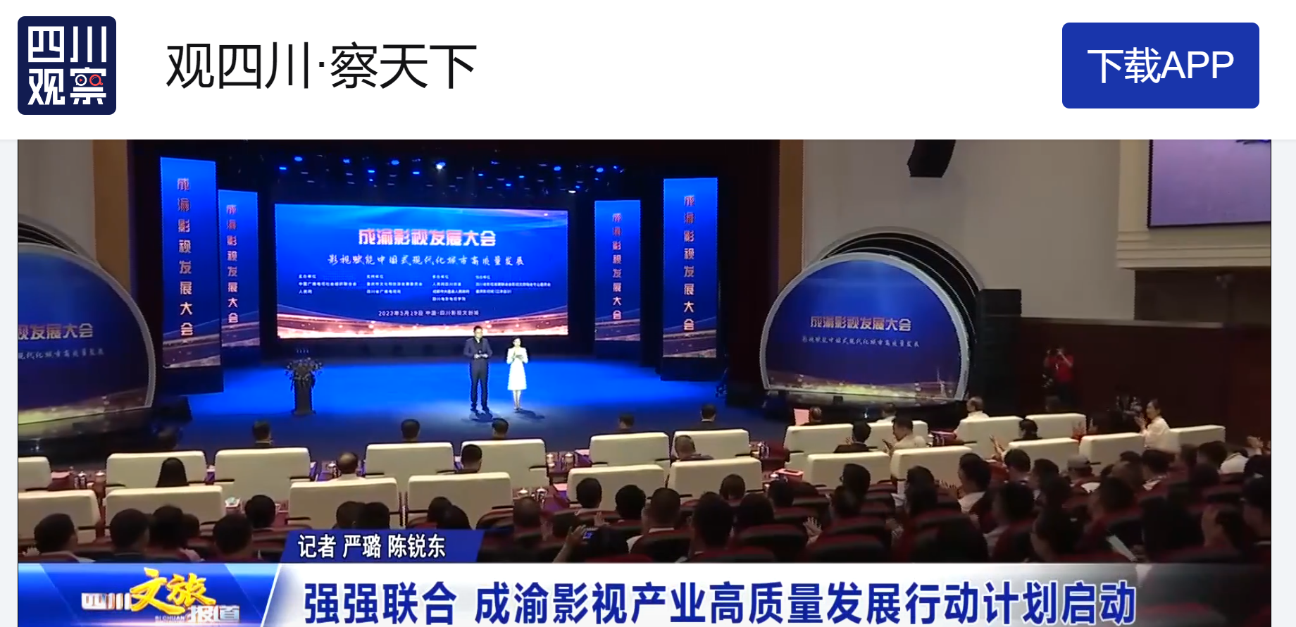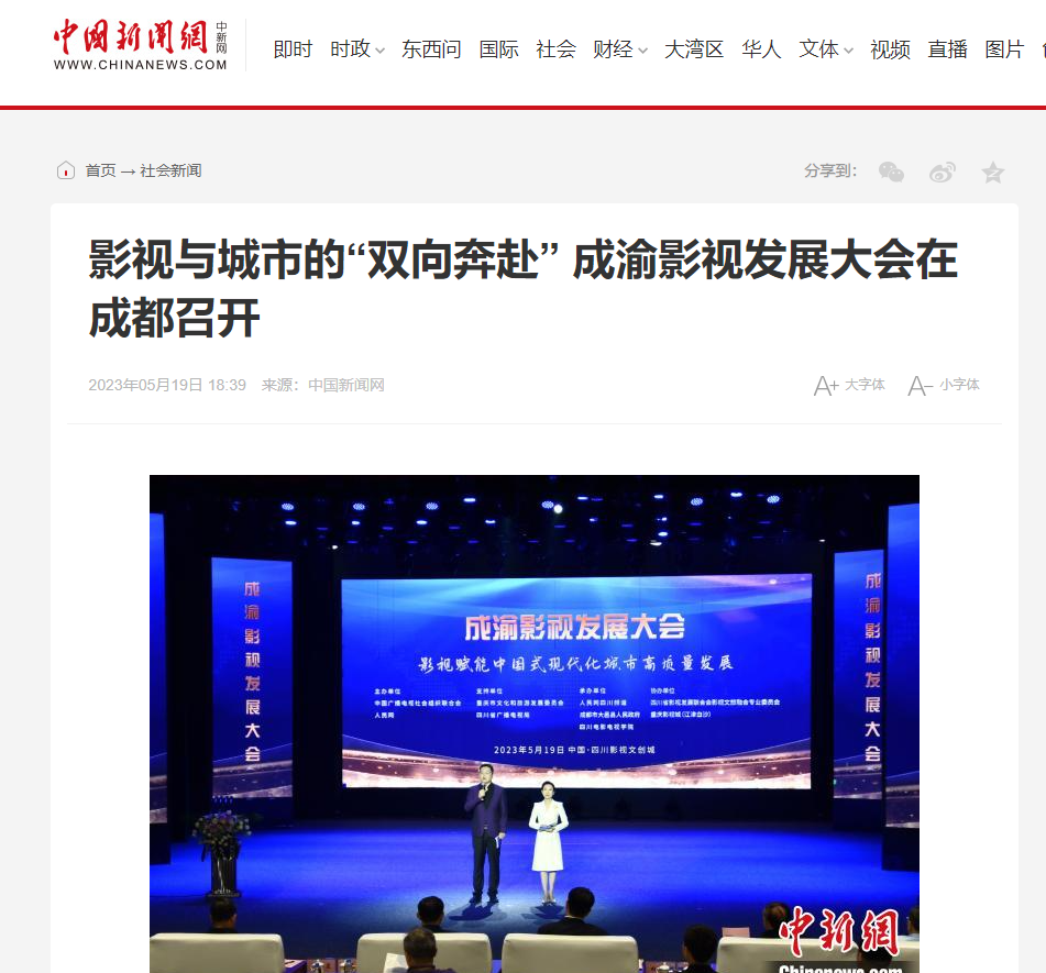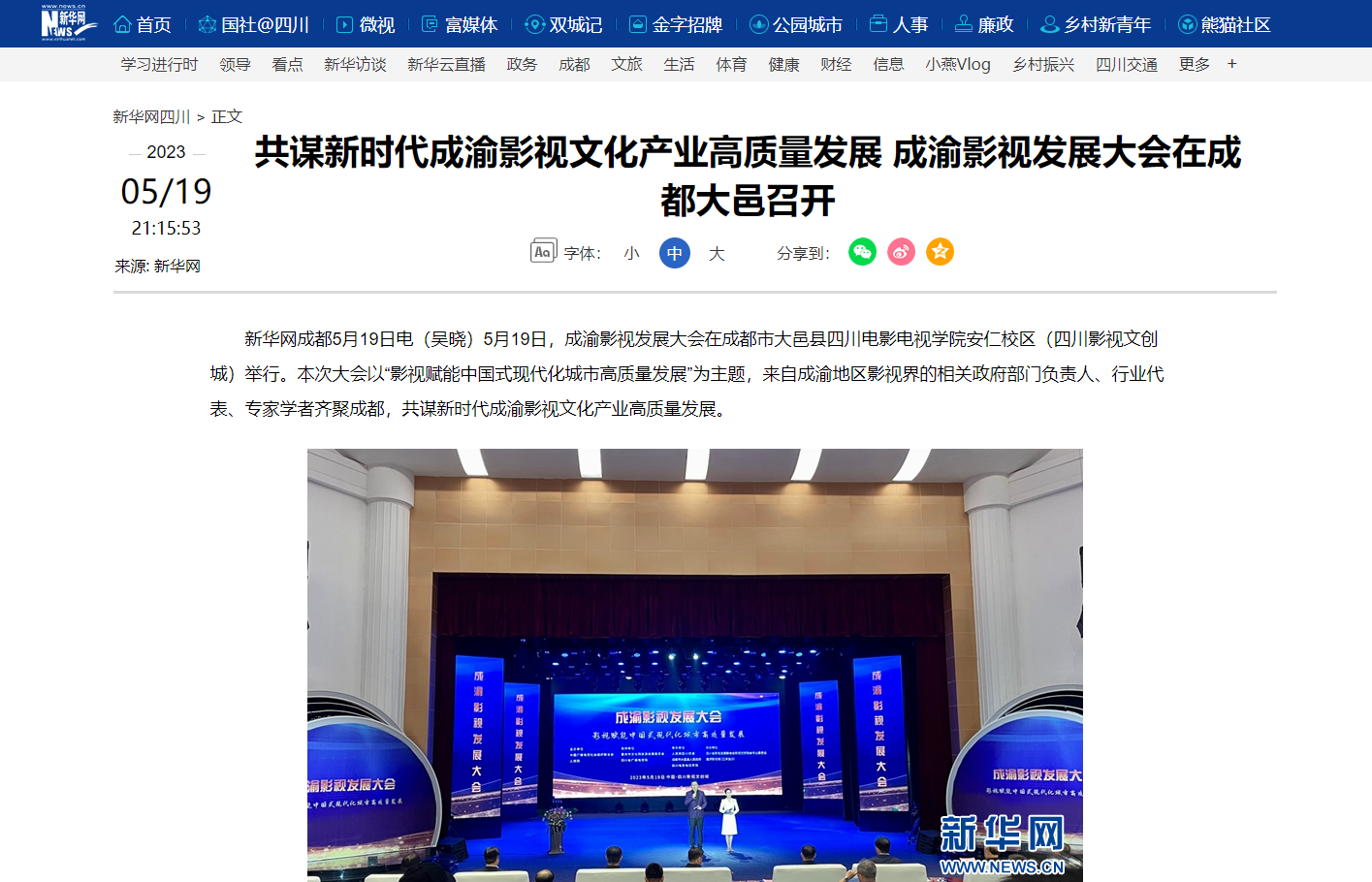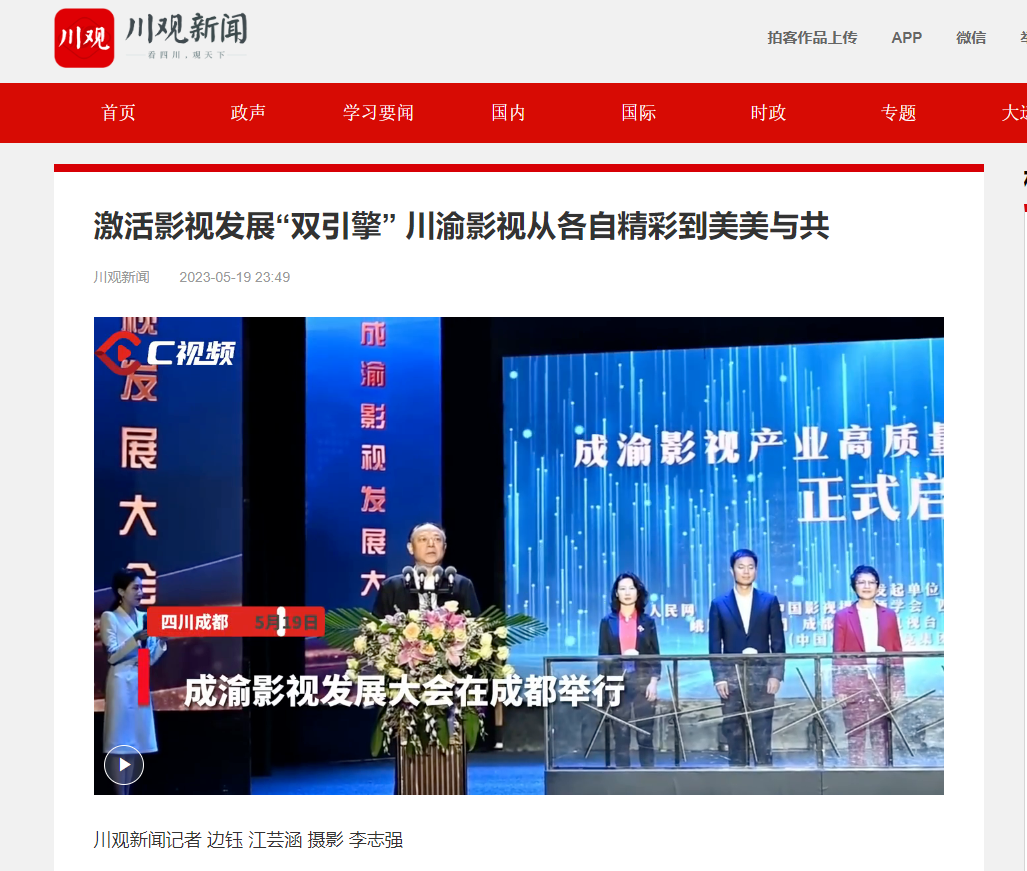 5月19日,成渝影视发展大会在成都市大邑县四川电影电视学院安仁校区(四川影视文创城)举行。本次大会以“影视赋能中国式现代化城市高质量发展”为主题,来自成渝地区影视界的相关政府部门负责人、行业代表、专家学者齐聚成都,共谋新时代成渝影视文化产业高质量发展。