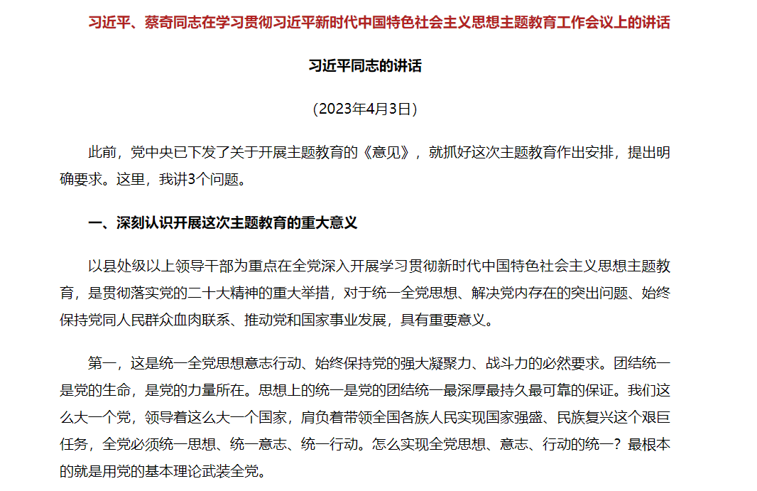 2023年4月3日,习近平总书记在主题教育工作会议上深刻阐述开展主题教育的重大意义和目标要求,对主题教育各项工作作出全面部署,为全党开展主题教育提供了根本遵循。